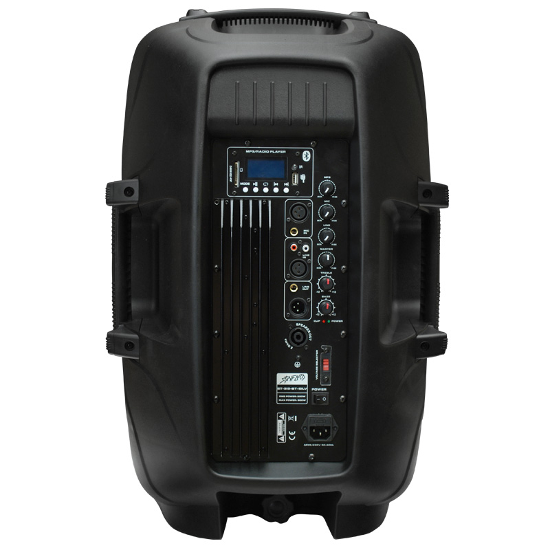 LK-1679-2-15B Aktív műanyag hangfal 15” Beépített mp3 lejátszó, FM rádió, USB/SD/MMC kártya olvasó, távirányító, bluetooth, passzív hangfal kimenet Összetevők: 1 x 15” mélysugárzó 1 x 1” magassugárzó Frekvencia menet: 40Hz - 18kHz Impedancia: 8 Ohm Teljesítmény (RMS): 300 W Érzékenység (1W/1m): 97 dB Csatlakozók: - Bemenet: XLR, RCA, TRS - Kimenet: XLR, TRS, SPEAKON Beépített hangfal adapter Méretek: 430 x 670 x 365 mm Súly: 18 kg A távirányítóval szabályozható funkciók: Rádió/mp3/bluetooth váltás, hangerőszabályzás, hangszínszabályzás, rádió csatorna váltás, mp3 léptetés, stb. (a távirányító csak a rádió/mp3/bluetooth modult vezérli)